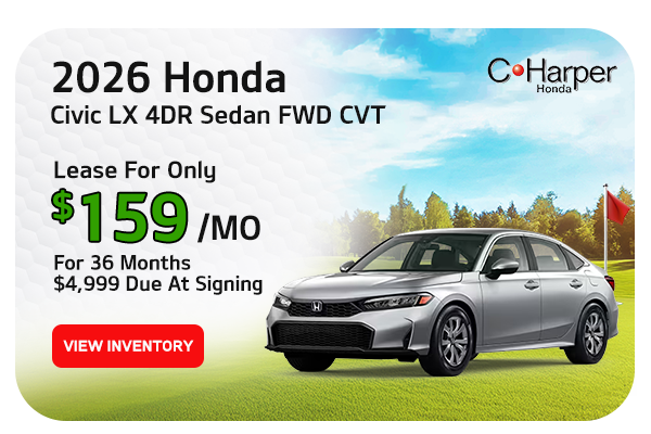 Based on Stock number H7196 VIN: 2HGFE2F27TH574905. Lease for 159/month, 36 months, 10,000 miles per year through Honda Financial Services $4,999 due at signing plus $500 HFS Lease Cash Plus, tax, $490 dealer document fee, state registration fees, and first payment. $0 Security deposit. Must qualify for Tier 1-8. Residency restrictions apply. See dealer for details. Limited availability. While supplies last. Vehicle shown for illustrative purposes only. Sale ends 4/30/2026